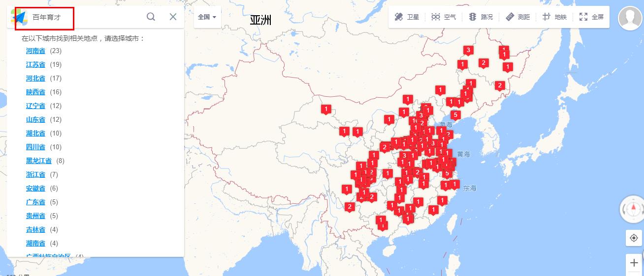 高德地图搜索“百年育才”呈现的全国布局效果