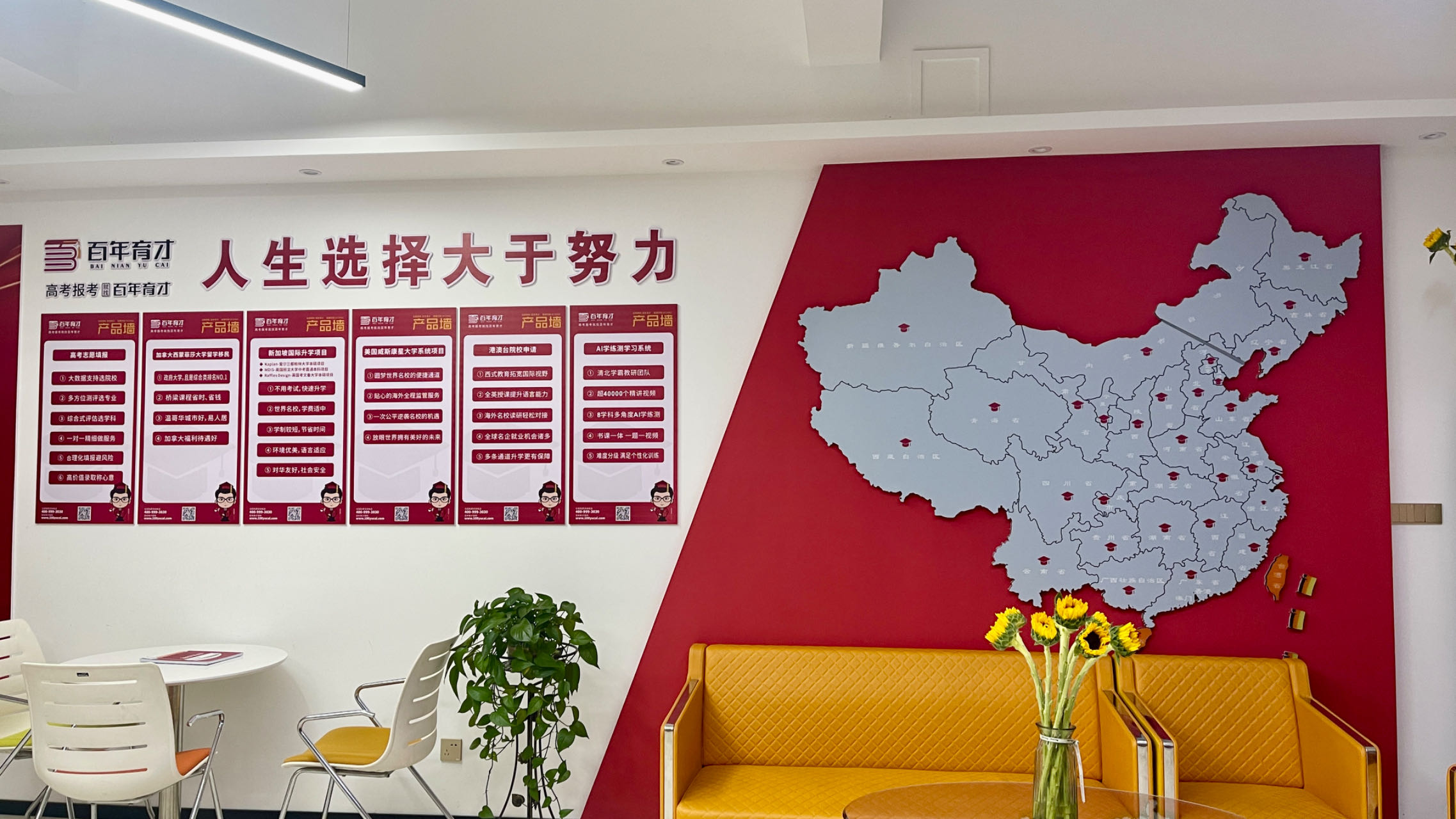 百年育才济源(沁园区)高考报考指导中心内设办公区、咨询区、会议区、高端VIP客户接待区,服务环境优雅,配套设施功能齐全。